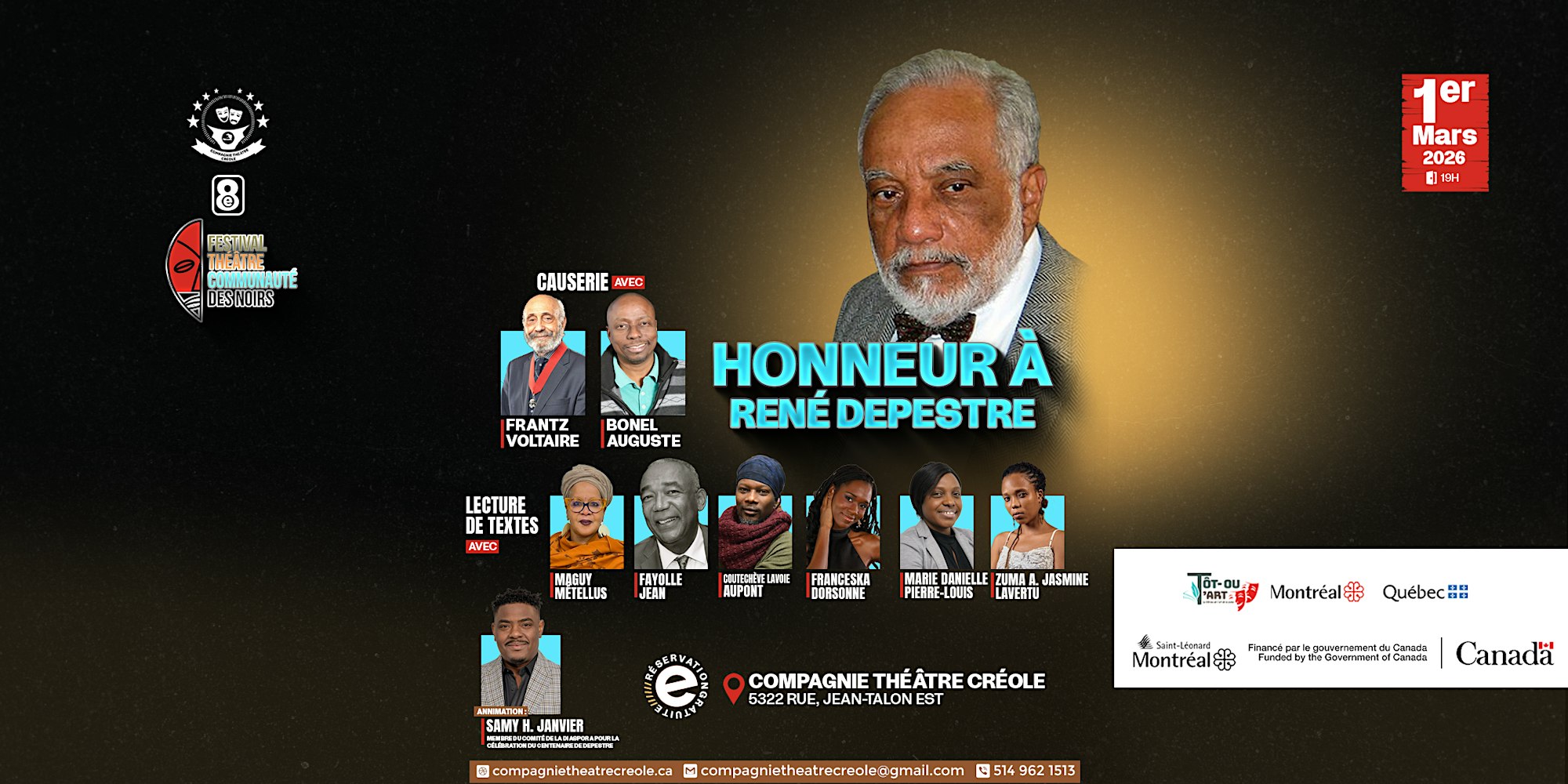 Dans le cadre de la 8e édition du Festival Théâtre Communauté des Noirs, nous vous invitons à une soirée exceptionnelle en honneur à René Depestre, figure majeure de la littérature francophone et voix engagée de la dignité, de la liberté et de la mémoire, en partenariat avec le représentant du comité de la diaspora pour la célébration du centenaire de Depestre, Samy Herto Janvier.